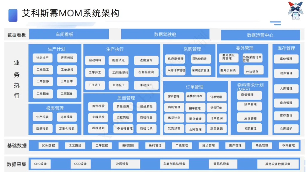 而艾科斯幂 MOM 系统,就是为了解决这两件事。它不是“做报表”的系统,也不是“可视化”的装饰,而是一个能生成真实数据、打破信息孤岛、推动执行闭环的制造系统中枢。