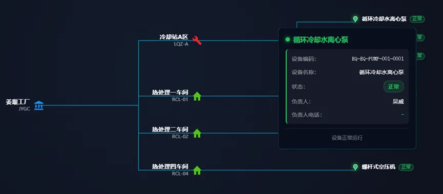系统提供全厂设备运行全景图,支持按厂区、车间、产线逐级展开设备状态,帮助管理人员快速掌握全厂设备运行态势,实现对生产现场的全局把控。