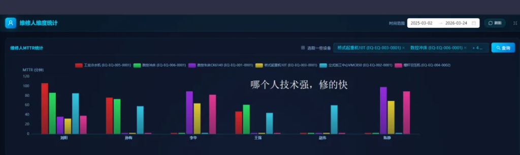 系统对维修人员能力进行量化分析,基于数据直观呈现,通过对比不同人员的维修效率看出:
